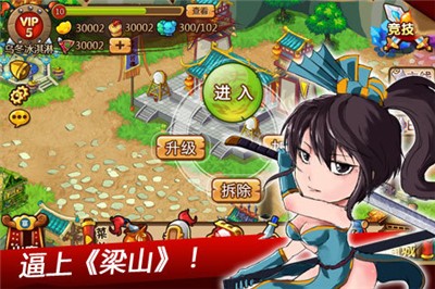 梁山OL是一款根据经典名著水浒传为故事背景打造的大型多人竞技策略类角色扮演游戏,梁山108将任你选择,多样化的竞技挑战搭配独特的战争玩法,感受最跌宕起伏的水浒故事剧情,带你全身心投入到这个热血纷争的水浒世界。