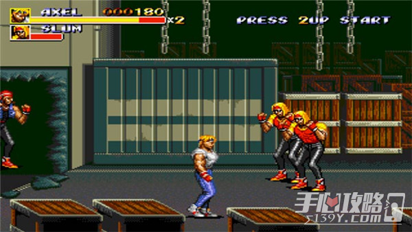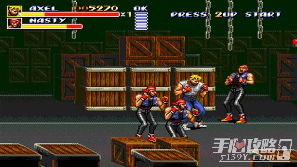 一开始左上角栅栏里有个炸弹,跑步前冲不久碰见车手,回头丢炸弹把他们炸下来,当然不推荐这样做,因为用炸弹是不加分数的前进一路打到场景尽头,三个栅栏了依次是钱袋,小加血.小BOSS出现(其中袋鼠可以收服),注意用背包扔袋鼠他是不费血的,因为倒地瞬间他会滚,想收服袋鼠方法就是只打训兽师,把训兽师打死后袋鼠不死就行了,他会跑掉就成功被你收服了,注意打训兽师不要贴着版边打,因为他不会出来的,把他打到版边里就要诱他出来了(其实这是中大多数敌人的特点,除少数几个象西服枪手矮机器人,最后一关大BOSS等)打死小BOSS后进舞厅,一开始右上角有个小加血,打完小兵后继续前进两个桌子里有一把匕首,会有小兵从天而降,注意下.最后两个桌子里有个大加血一个木棍,之后进人房间,大BOSS两个猫女献身,其实这关BOSS是比较烦人的,不断的跳来跳去,注意当她向你身边跳的时候就毫不留情马上A,因为她要么踢你要么落地后背包(不可挣开),近身用Bx4下(大多数BOSS适用)伤血可观,打猫女反正不要跳B和她抢空就行了,因为AXEL跳的没她高,无空中优势。
