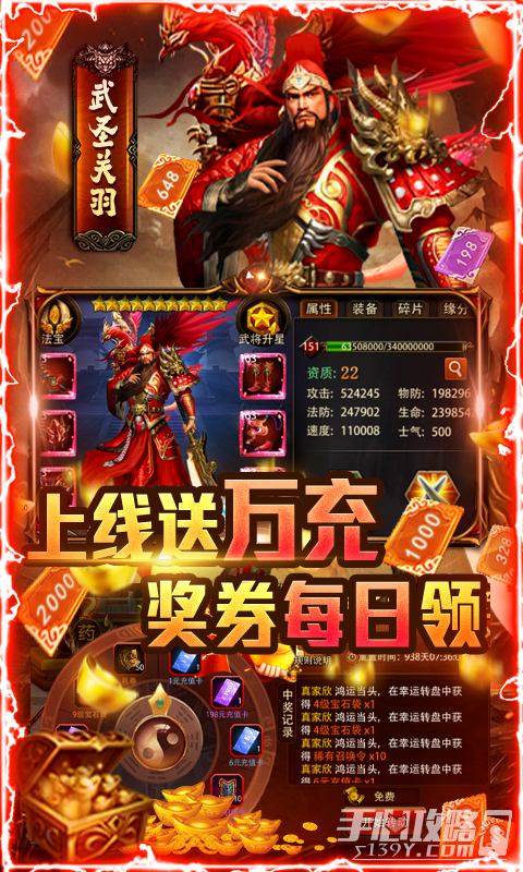 2、三国大英雄2023版已经破解了游戏中的商城,所有福利礼包1元宝购买,同时上线就送百连抽、橙将红包、百万银两,各种珍贵装备超值代金券,返还比例1:1000,还有更多福利尽情亲身下载游玩