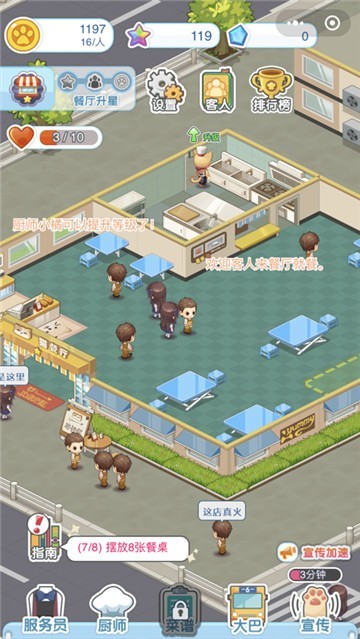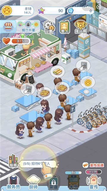 1、满足到店客人的需求,获得海量的金币扩大餐厅的规模,赚取金币扩大店铺;